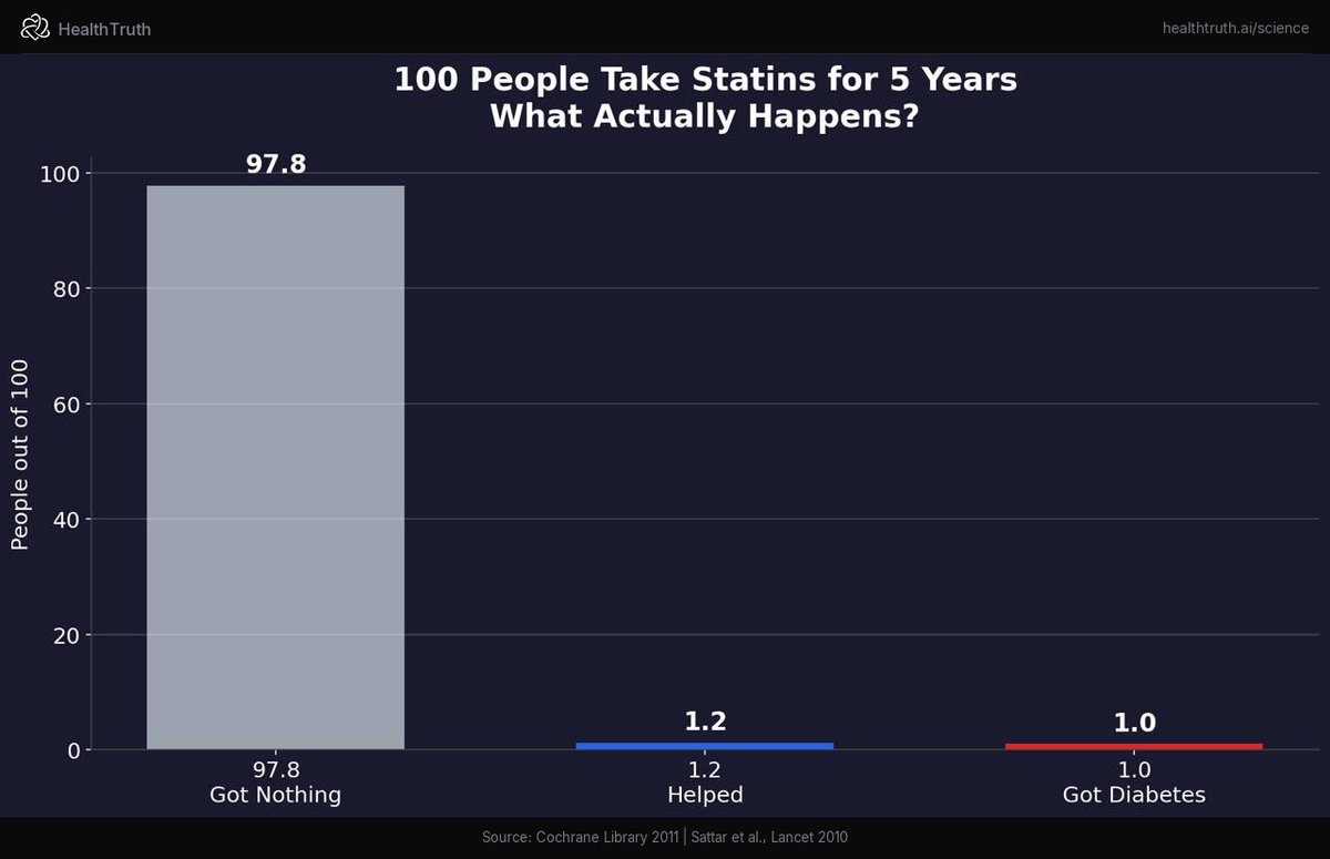 1/ That's not a typo. The absolute risk reduction of statins is 1.2%. But the pharmaceutical industry markets it as 36% ā the relative number. Blue is what they tell your doctor. Red is the truth. A 2010 Cochrane Review confirmed it. Dr. Aseem Malhotra published the same finding in the BMJ.