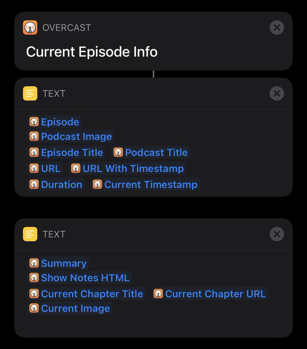 The latest @OvercastFM update added new data to the “Get Current Episode Info” action that lets you extract 13 pieces of information to use in building shortcuts: