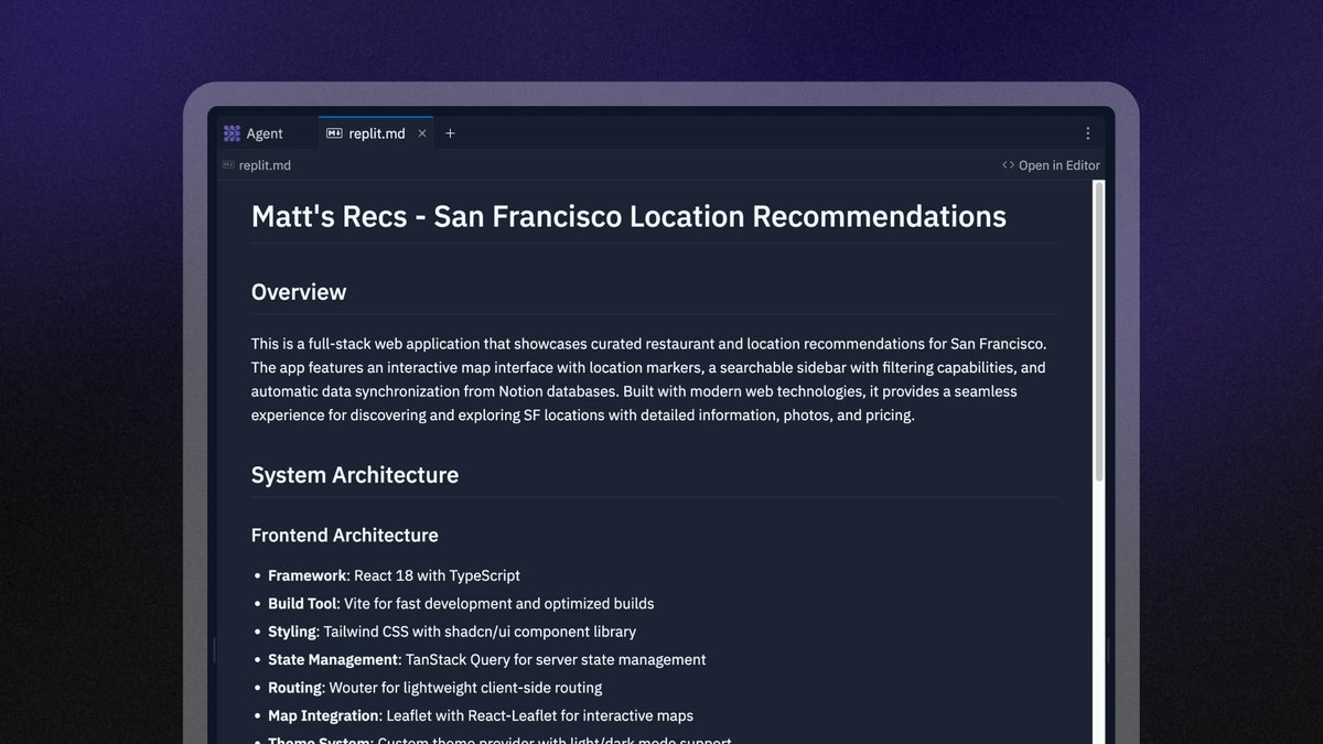 A file called 'replit.md' now gets created in every Agent project. The purpose of replit.md is twofold: