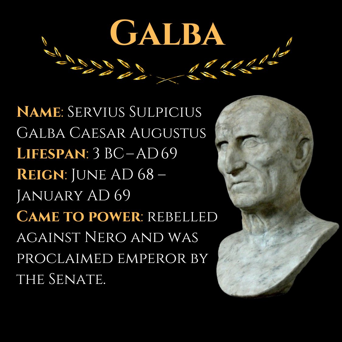 Came to power: Governor of Hispania Tarraconensis who rebelled against Nero and was proclaimed emperor by the Senate.