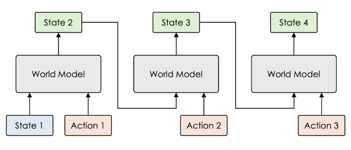 Gradient-based planning starts with a world model that takes in the current state (e.g. an image) and an action, and predicts the next state. We can stack this world model on top of itself again and again, turning it into a differentiable simulator of the environment. 2/11
