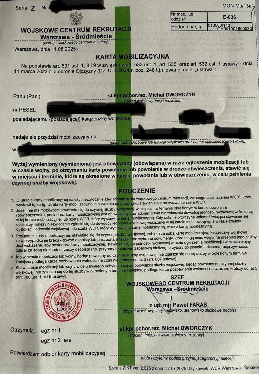 2/11 Kiedy wszedłem do zatłoczonej poczekalni skonstatowałem, że jestem jednym z młodszych oczekujących po odbiór przydziału mobilizacyjnego, czy wezwania na ćwiczenia. Na dodatek nie tylko jednym z młodszych ale i szczuplejszych - co dla mnie samego było dużym zaskoczeniem... Po pewnym czasie, kiedy przyszła moja kolej stojąc przy biurku w pokoju, w którym byli obsługiwani wezwani, usłyszałem mimowolnie, jak wyraźnie starszy ode mnie pan tłumaczył żołnierzowi wydającemu dokumenty: „proszę pana, ja miałem dwa miesiące temu zawał, ja naprawdę, nie mogę stawić się na te ćwiczenia…”