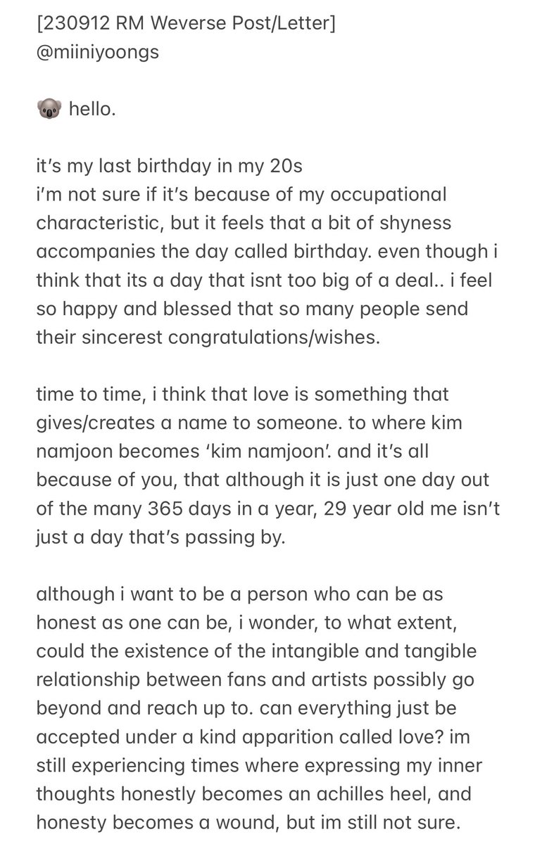 🐨 time to time, i think that love is something that gives/creates a name to someone. to where kim namjoon becomes ‘kim namjoon’. and its all because of you, that although it is just one day out of the many 365 days in a year, 29 year old me isn’t just a day that’s passing by.