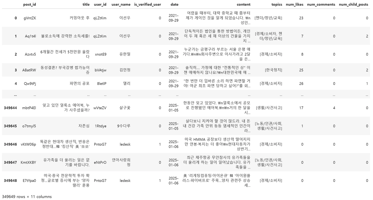 저희는 얼룩소의 서비스 종료 약 일주일 전, 41,769명의 전체 유저들의 2,631,062건의 활동 로그를 모두 수집하는데에 성공했습니다. 이는 서비스 종료 직전까지 각 유저들이 ①어떤 게시물을 작성했는지, ②어떤 게시물에 좋아요를 클릭하고 ③댓글을 남겼는지, 그 이력을 빠짐없이 담고 있었습니다.