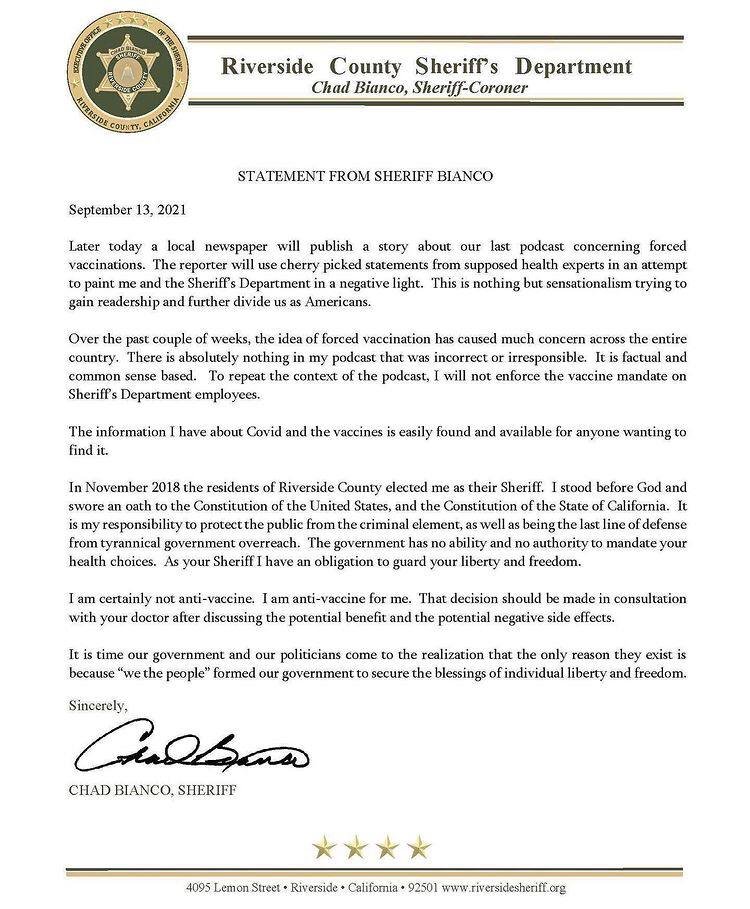 第三世界のカリフォルニア・リバーサイド郡保安官ビアンコはワクチンの義務を強制することを拒否し、政府には権限がないと言っています「あなたの保安官として私はあなたの自由を守る義務があります」との事、おパヨさんもさすがに自分の事だと困るようです😁