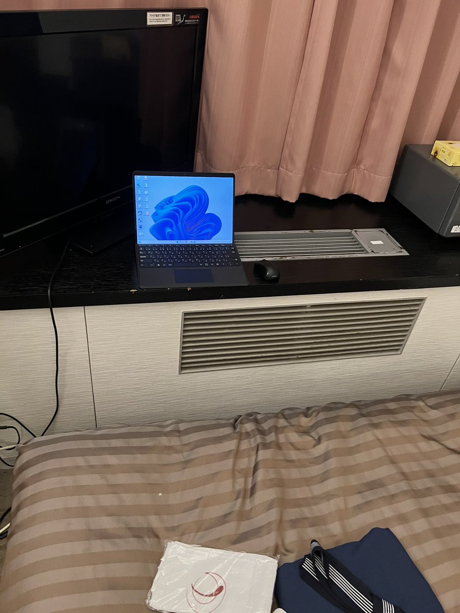 部屋はこんな感じでかなり古いですが匂いとかは無し。トイレも部屋にありウォッシュレットでした。いちお写真(右)のように多少不安定ながらテレワークデスクも完備。ワーケーションにも利用できるホテルですね(笑)
