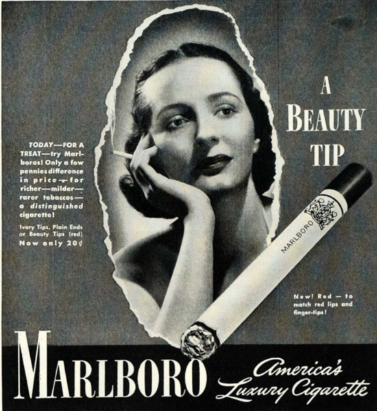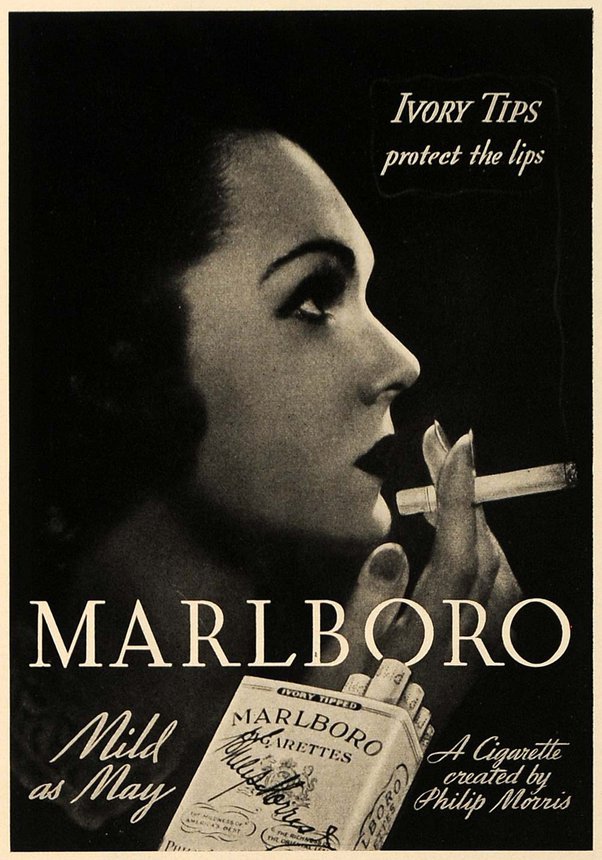 úrovních. Tou první je kompletní repositioning samotné značky. Cigarety #Marlboro se na americkém trhu objevily ve 30. letech jako prémiová značka určená pro ženy. Slogan “Mild as May” vyzdvihoval jemnost a fakt, že filtrové cigarety potlačují dráždivý kašel, červené “Beauty Tip”