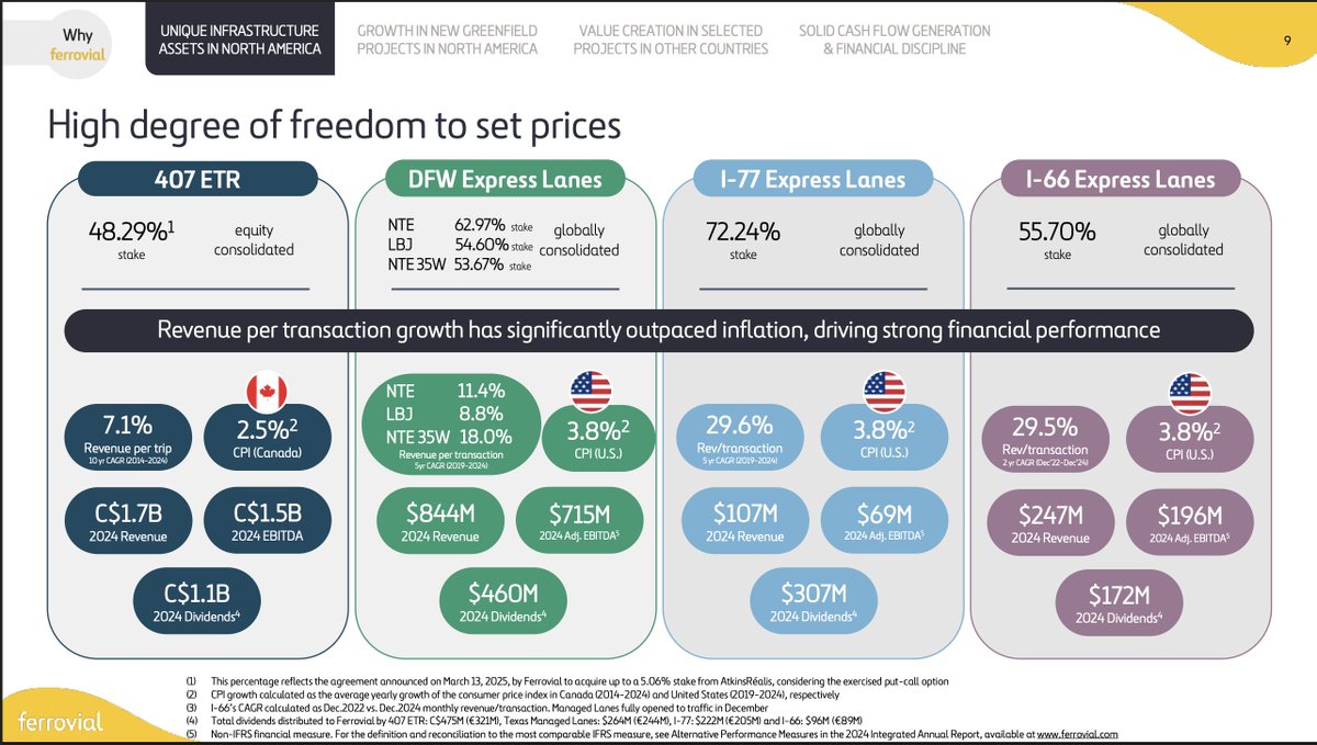 • Canada (The 407 ETR Model): This is widely considered one of the best infrastructure assets in the world. In 1999, the government signed a 99-year lease that effectively allows Ferrovial to raise tolls indefinitely, provided a minimum number of cars still use the road. Because Toronto traffic is so severe, drivers continue to pay regardless of the cost, and the government has no legal recourse to stop the price hikes. And by the way, this highway runs at an ~89% EBITDA margin.