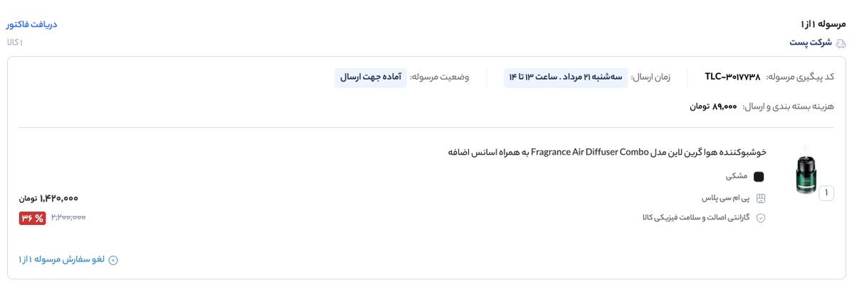1️⃣ سهشنبه ۲۱ مرداد از سایت تکنولایف یک خوشبوکننده Green Line خریدم. قیمت؟ ۱,۴۲۰,۰۰۰ تومان.