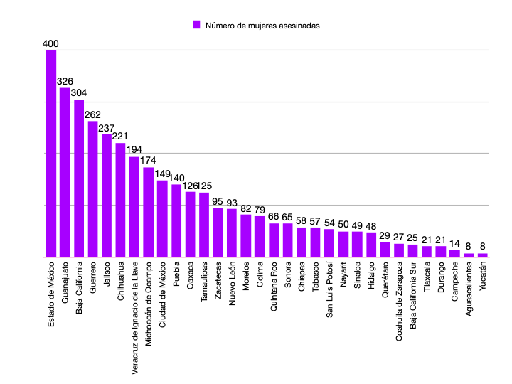 Durante 2018 fueron asesinadas 3607 mujeres, El primer lugar lo ocupa el Estado de México con 400 mujeres asesinadas. En el estado de México hay víctimas por violencia intrafamiliar, comunitaria pero también son asesinadas por la delincuencia organizada y delincuencia común