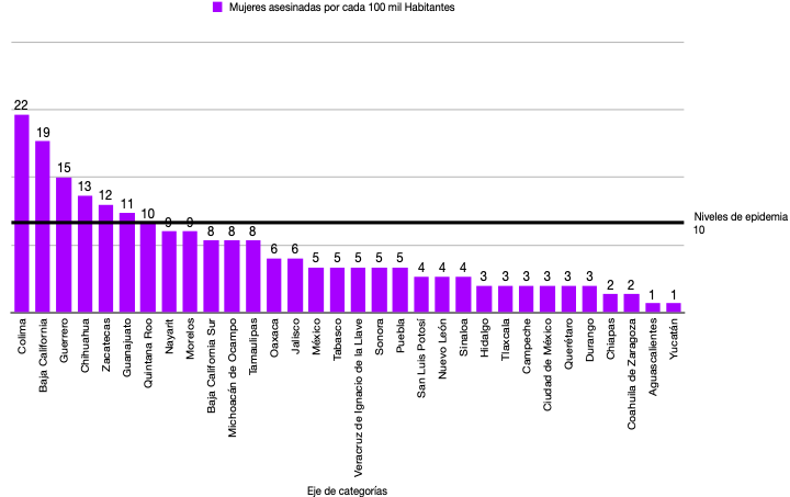 Por tasa poblacional, tenemos siete estados que ya superan los niveles de epidemia de violencia según la OMS. Son estados con presencia del crimen organizado, las mujeres en la mayoría de los casos sus asesinatos tienen el sello del crimen organizado