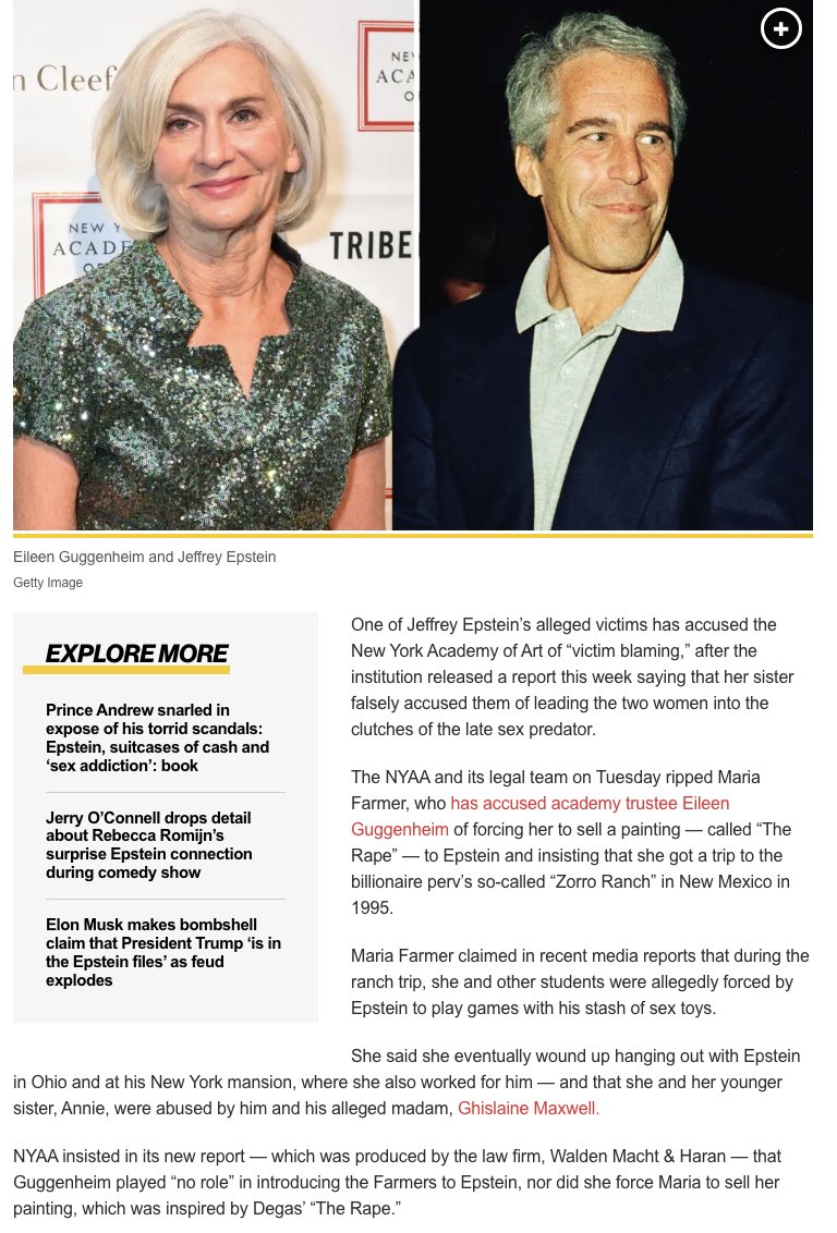 Eileen Guggenheim forced Maria Farmer to sell her art to Epstein while she was a student at the New York Academy of Arts. Guggenheim also brought Farmer down to his New Mexico ranch. artforum.com/news/student-a…