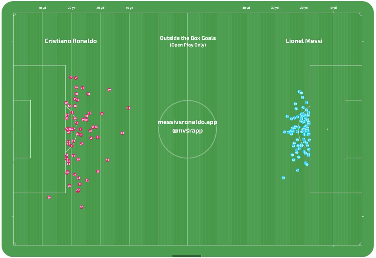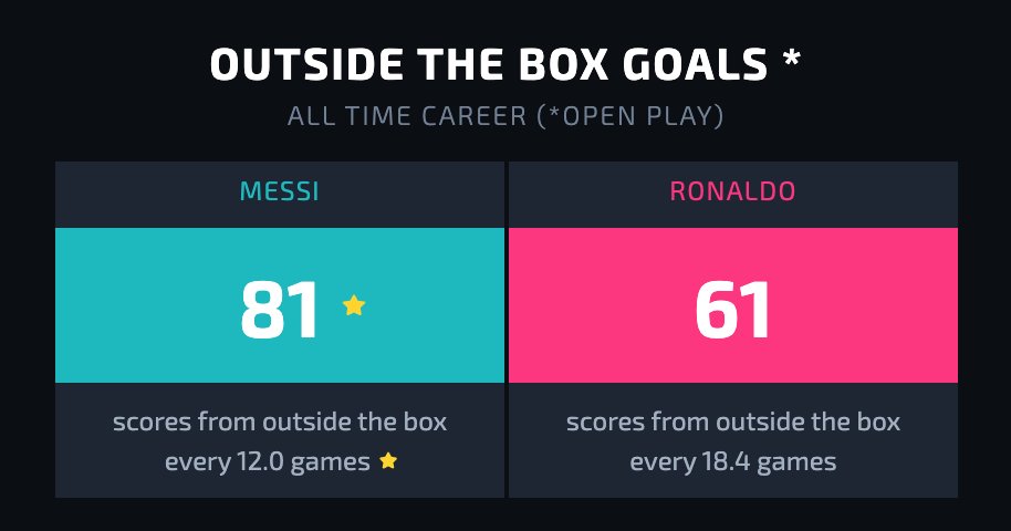 As you can see, Ronaldo's outside the box goals come from much more varied positions, with several from almost impossible distances, whereas Messi's are more clustered in and around the D.