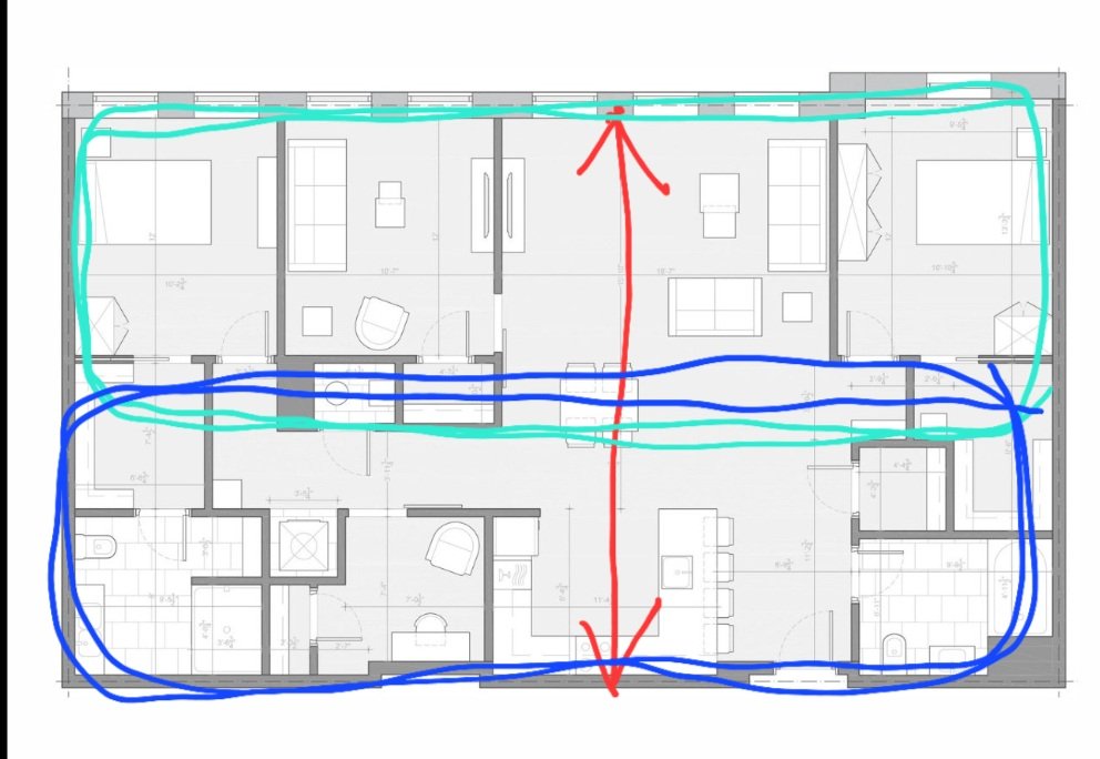 Everyone knows that deep floorplates (red arrow) make units tough - with window access only on one side, you pretty quickly get lots of dark spaces deep in the unit.