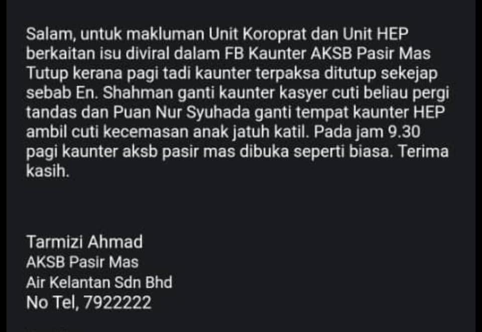 Ni rentetan isu seorang pelanggan ke Pejabat AKSB Pasir Mas. Pukul 9.13 pagi masih tiada staf di kaunter.