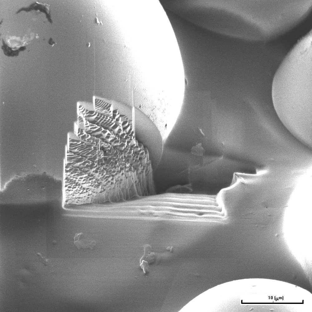 So what do you do when @jeriellsworth's @tiltfive sends you a sample of the retroreflectors they use to make their table top AR system? Of course I stick it in a Focused Ion Beam Microscope to figure out how they are made by slicing them in half with a beam of metal. [Thread]
