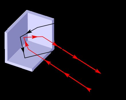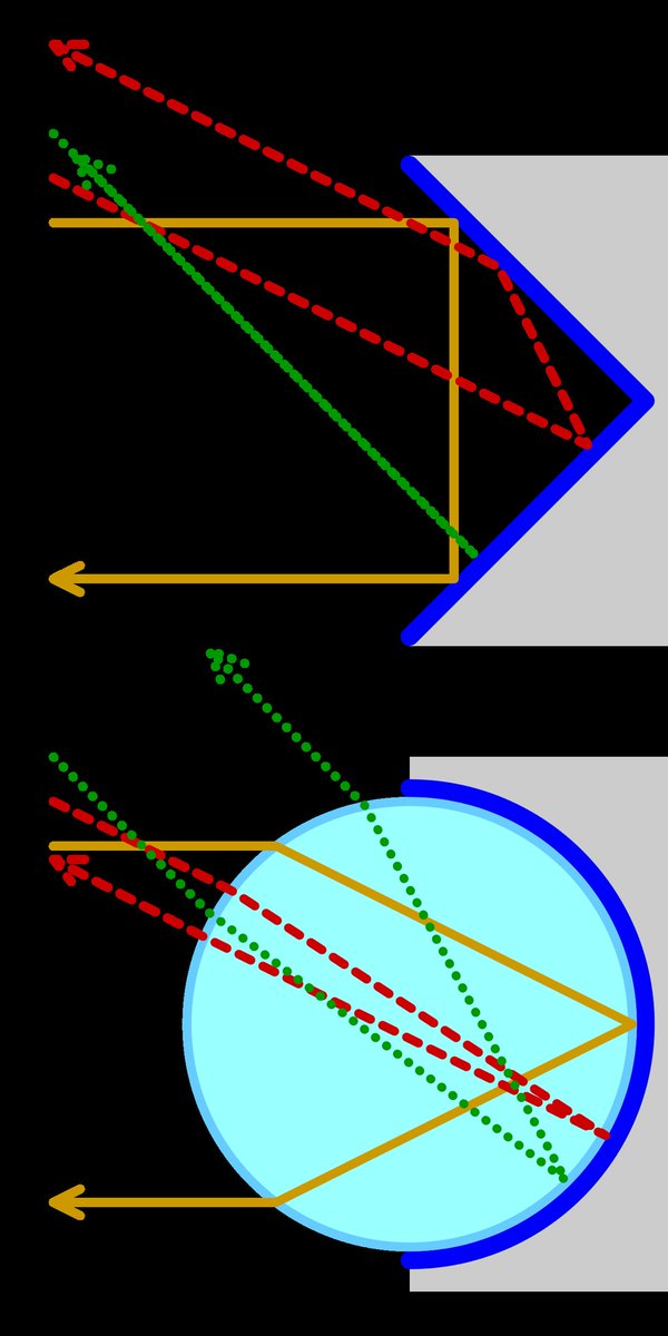 So more about those spheres. You may be familiar with corner based retroreflectors, where light that enters it bounces off of the 3 surfaces in such a way it comes back directly at the source of the the light. Turns out the glass spheres also work as retroreflectors. (Wikipedia)