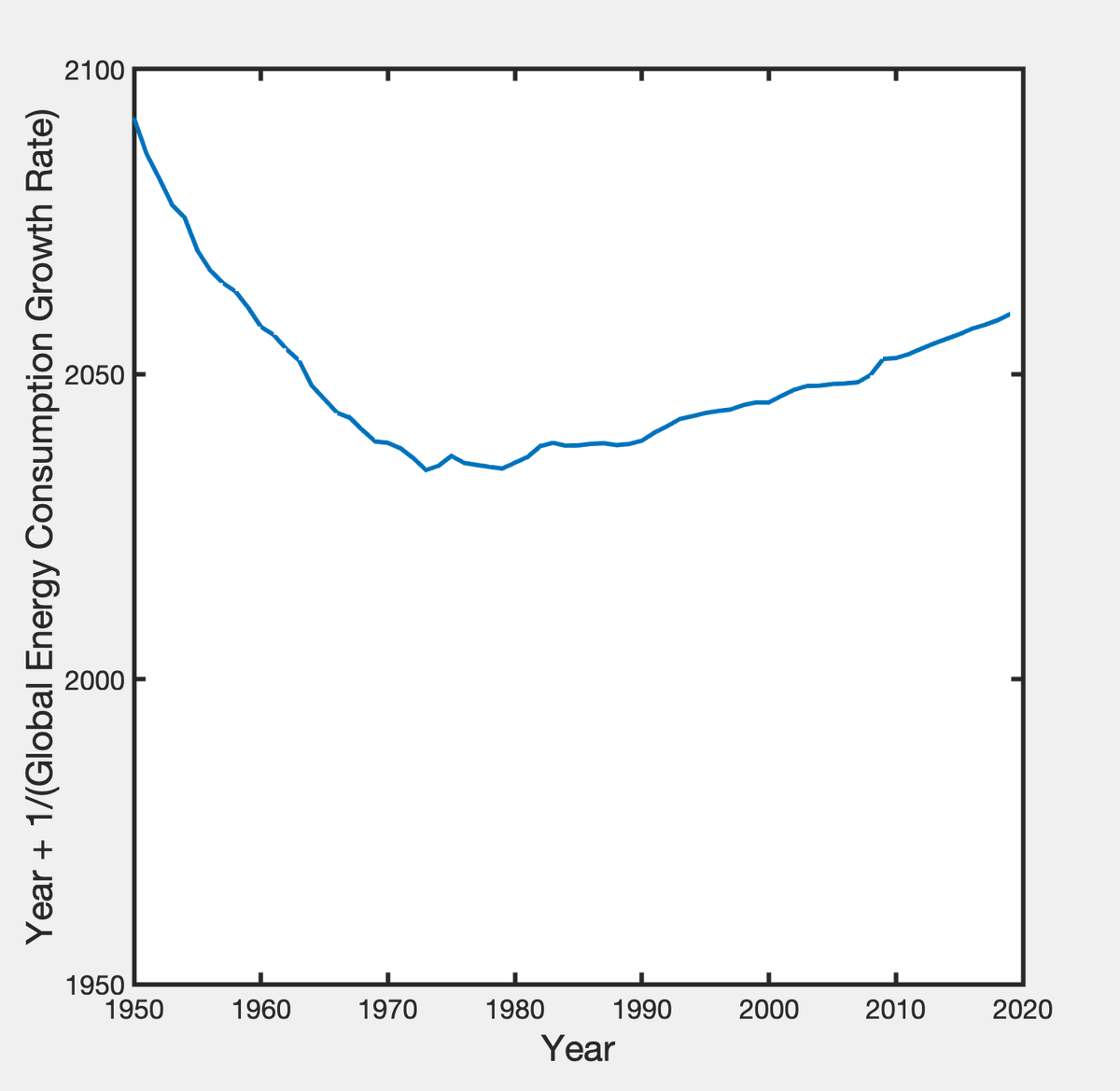 4. Taking the inverse of rates gives a time: 142 years in 1950, 69 years in 1970, 49 years in 1990, 41 years in 2019