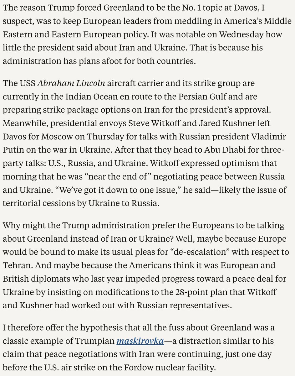 There is a rapidly forming narrative in the European and liberal media that the Europeans “won Davos”: primarily by getting Trump to “de-escalate” his demand that the United States acquire Greenland from Denmark. 1/8