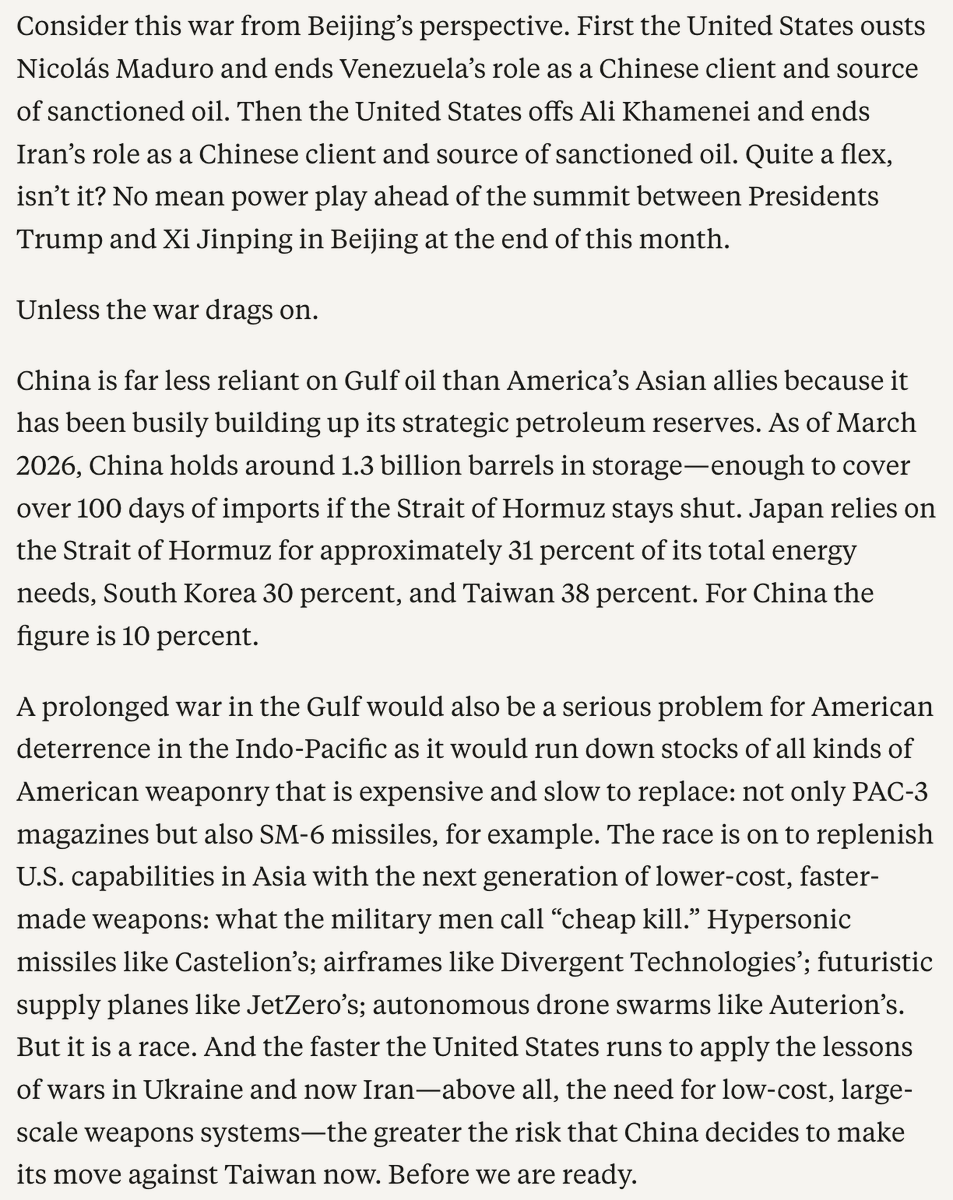 My new @TheFP essay asks the ten key questions about U.S.-Israeli war against Iran. 1. How long will this war last? 2. Do we have enough firepower relative to Iran? 3. Can the Iranians keep the Strait of Hormuz closed? 4. Can the Iranians hit Saudi and other Gulf oil infrastructure? 5. At what point does Iranian "regime alteration" happen? 6. How widespread will the war get? 7. Can the U.S. get the oil flowing even if the war drags on? 8. How big a shock would it take to damage the U.S. economy? 9. How long can the Republican Party sustain this domestically in a midterm year? 10. What does the war against Iran mean for other actual or potential conflicts?
