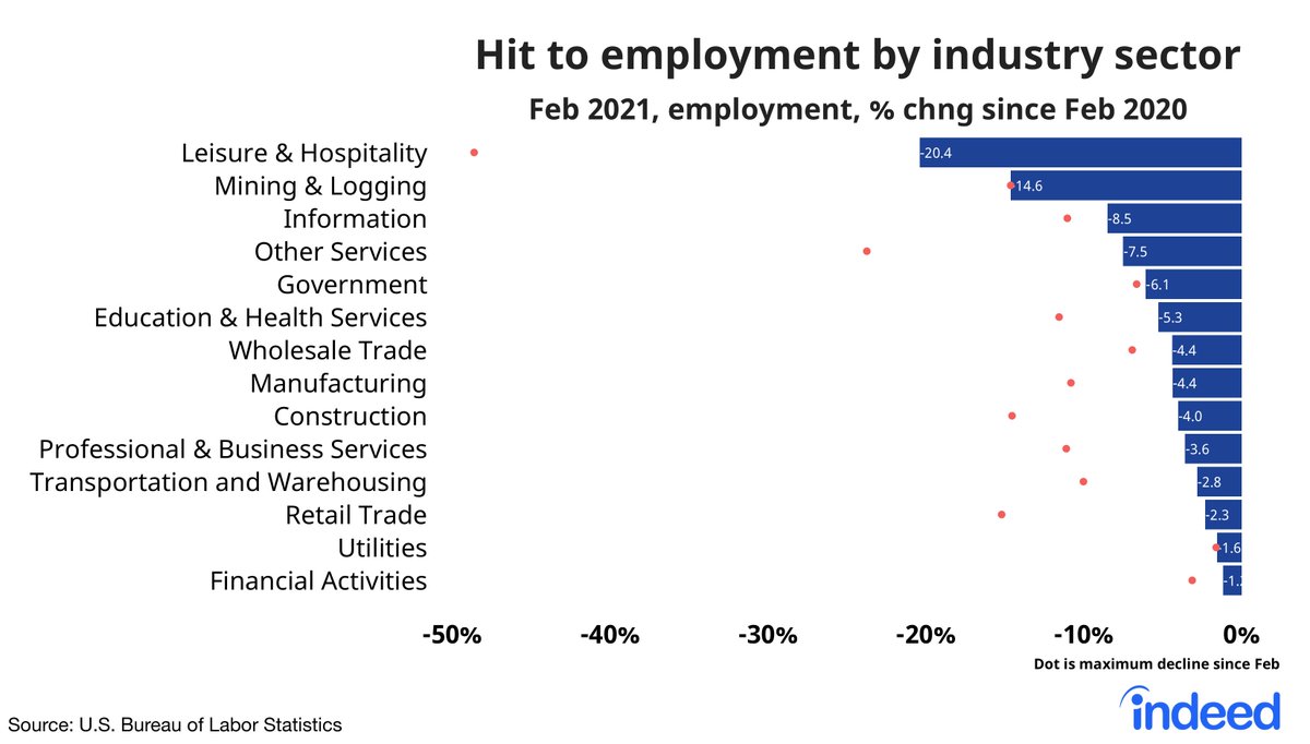 And while leisure and hospitality was the jobs growth leader this month, employment in those industries is still down 20% from a year before.