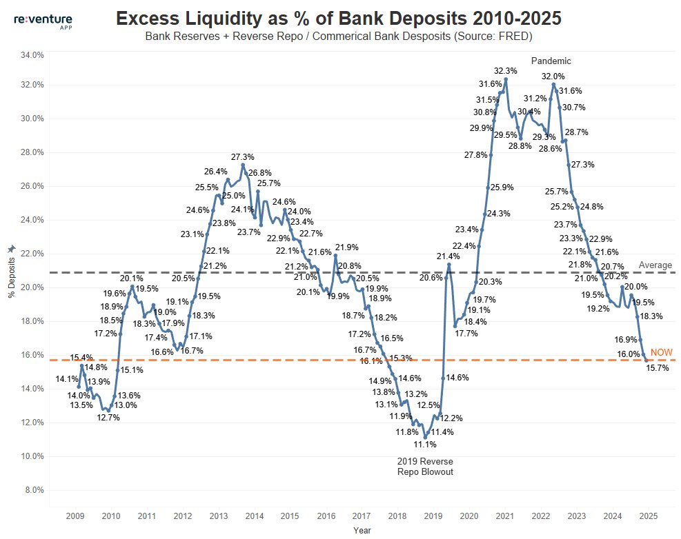 1) There are several metrics you can use to gauge how much reserve liquidity the Fed needs in the system for their "ample reserves" regime - one is GDP, another is M2, but my personal favorite to gauge this is bank deposits.