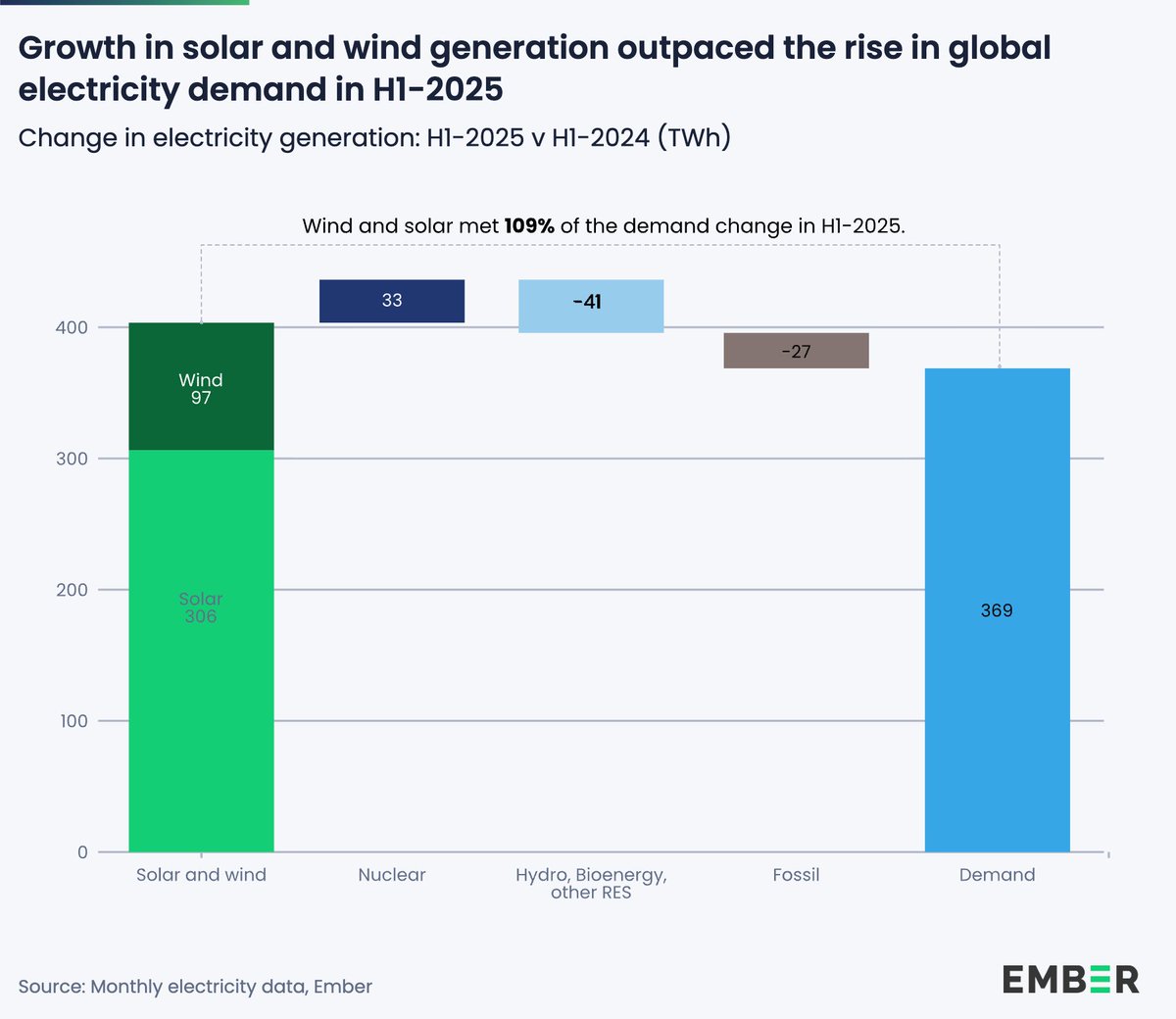 On a global level, wind and solar met and exceeded the growth in electricity demand, particularly as a result of record breaking solar growth.