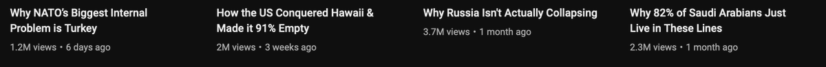 1) High Demand Topics --> Real Life Lore focuses on current event topics with the main key word, the country itself. The relevancy allows for a higher search volume and therefore a higher chance of more views per video.