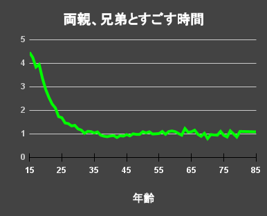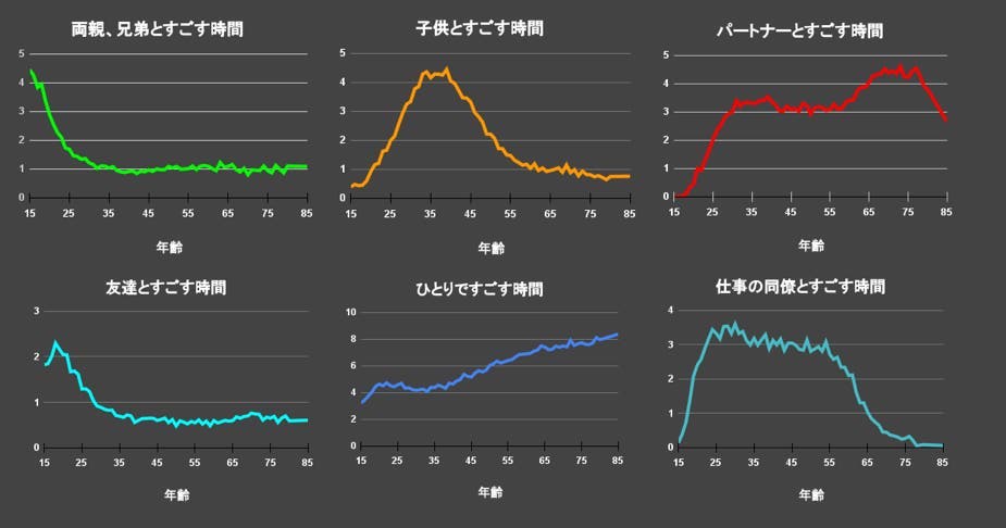 家族、兄弟、パートナー、友達、職場の同僚、それぞれの人達とすごす時間を年齢ごとに示した