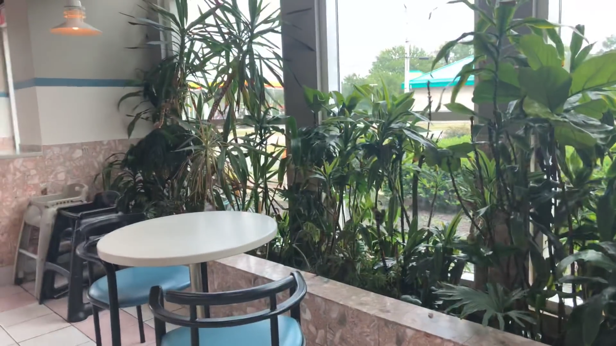 featuring a 1980's glass-and-marble aesthetic, this mcdonald's had outdoor fountains upon opening.
