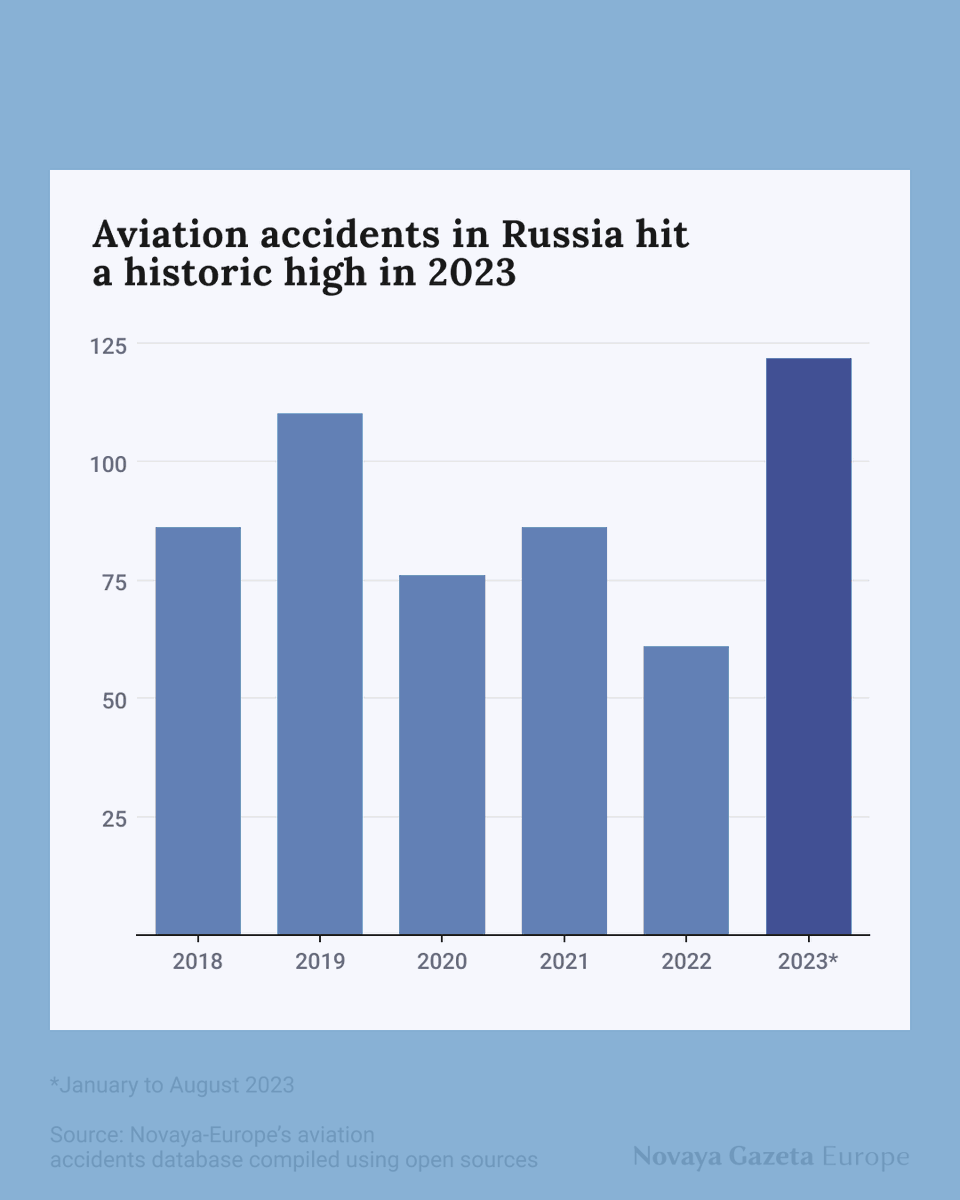 By analysing open-source data, Novaya-Europe has found that there were over 120 aviation accidents involving passenger planes used by Russian airlines in the first eight months of this year: 2.2 times higher than it normally is. 2/6