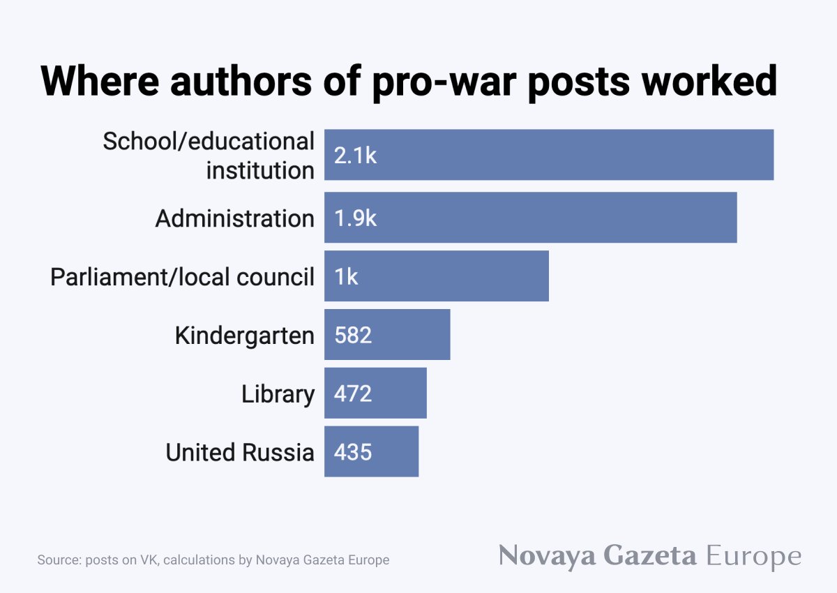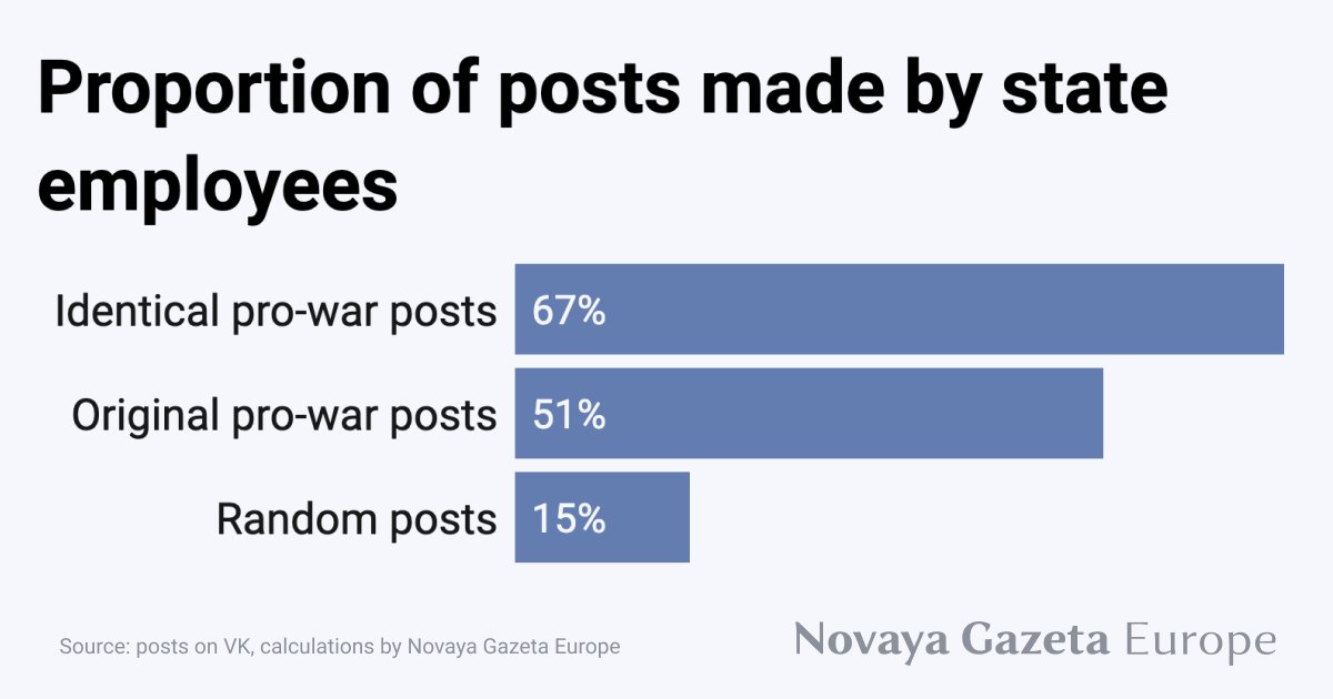 At least 45% of VK posts with pro-war hashtags have been copied somewhere between 5-100 times on average. Of people who list their job in their profiles, 67% of users posting copies of pro-war content are state employees. 2/6