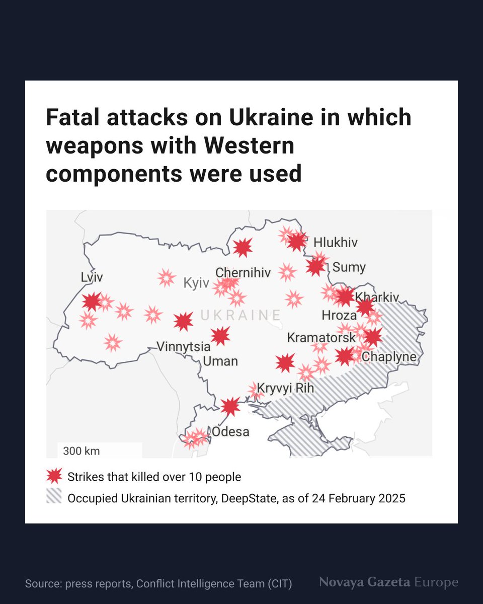 According to Novaya Europe’s calculations, for which data published by Ukrainian Defence Intelligence (GUR) was used, at least 722 Ukrainian civilians have been killed in Russian attacks using weapons built with foreign components since the war began.