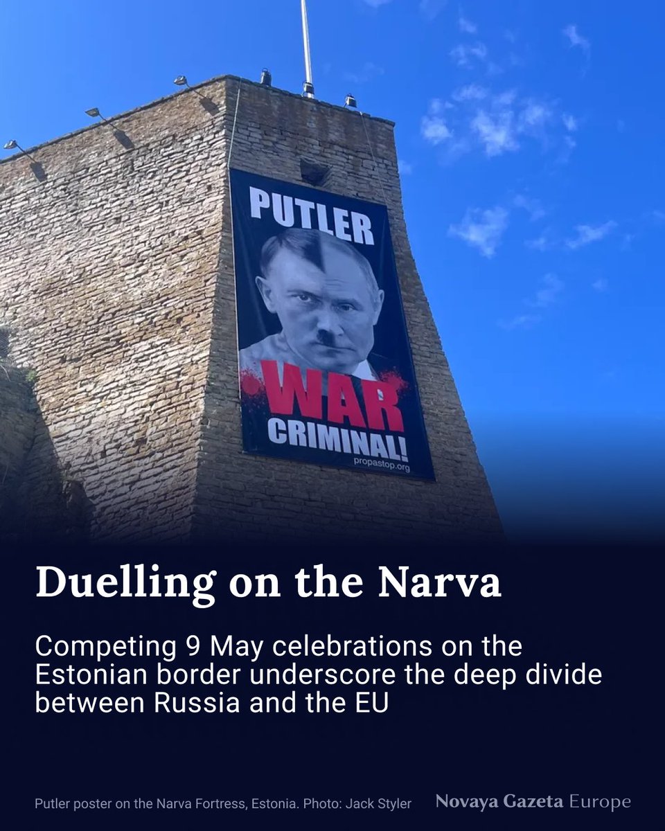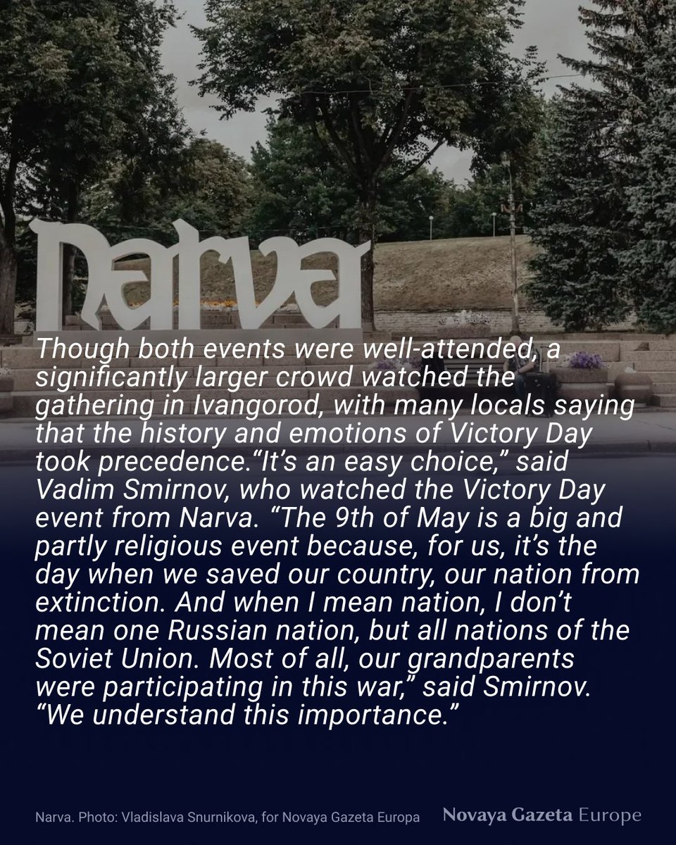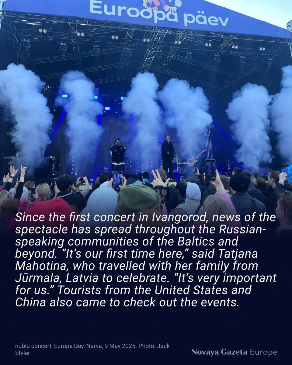 At the start of the Victory Day event in Ivangorod, the emcee welcomed his “dear friends” in the city of Narva, drawing cheers from the Estonian crowd that carried across the water.
