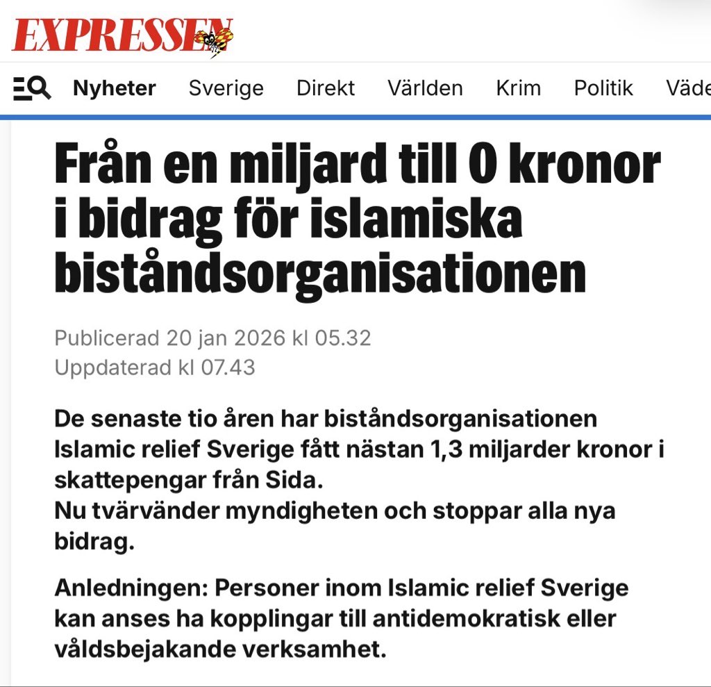 2/10 Islamic Relief Sverige är bara ett exempel. Nära 1,3 miljarder kronor från Sida på tio år. Först 2026 stoppas nya bidrag, trots återkommande internationella varningar, granskningar och dokumenterade kopplingar.
