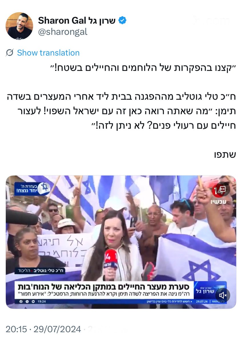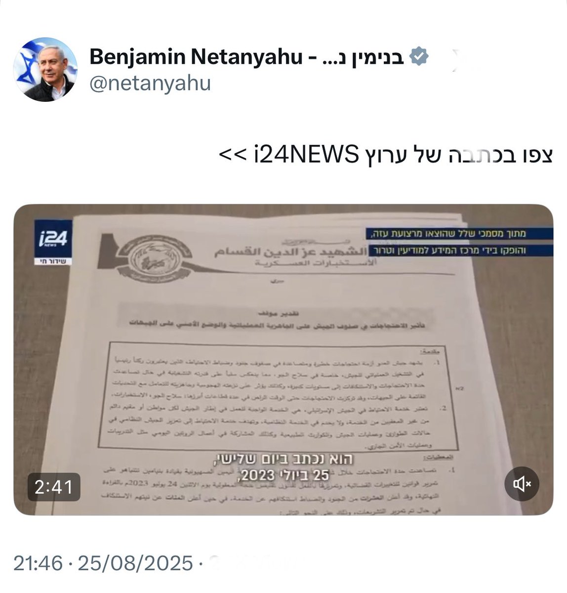 בסרטון, שאורכו 2:41 דקות, מקריא כתב הערוץ כיצד מודיעין חמאס תיאר בפני יחיא סינוואר את השפעת "הסרבנות" והמחאה, אשר יצרו משבר ופגעו בצבא.