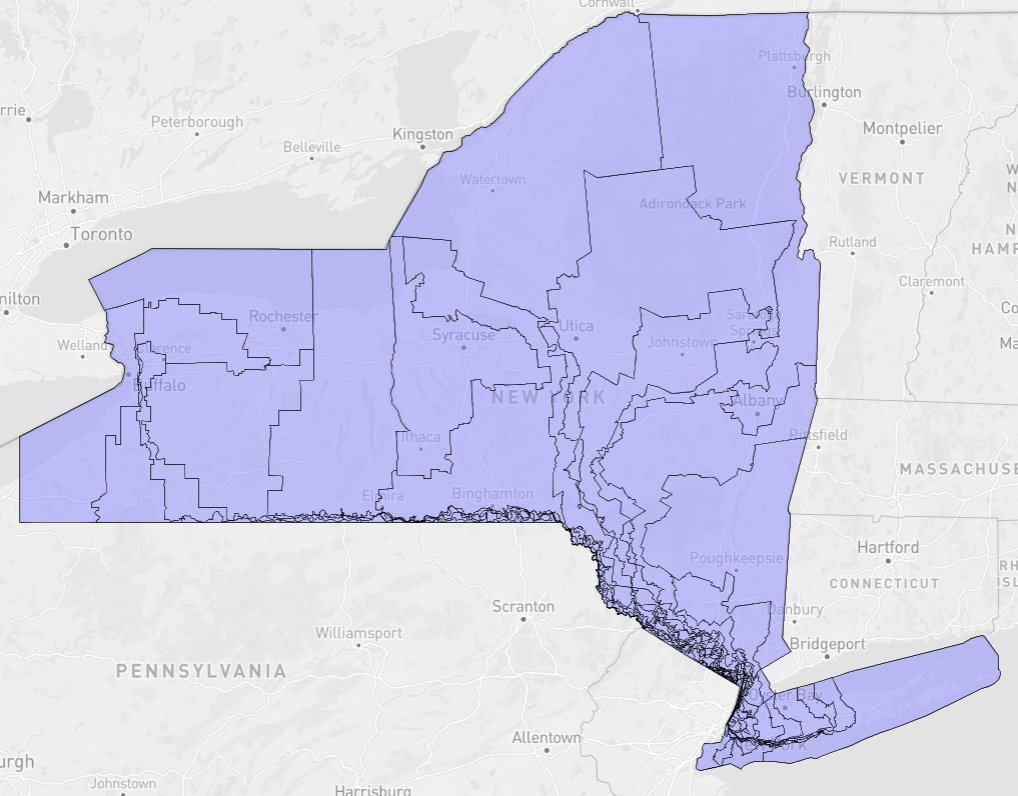 The map above is on the 2022 gubernatorial election, where Kathy Hochul won statewide by a 6.39% margin of victory. All districts are at least a 6.3% margin of victory for Hochul.