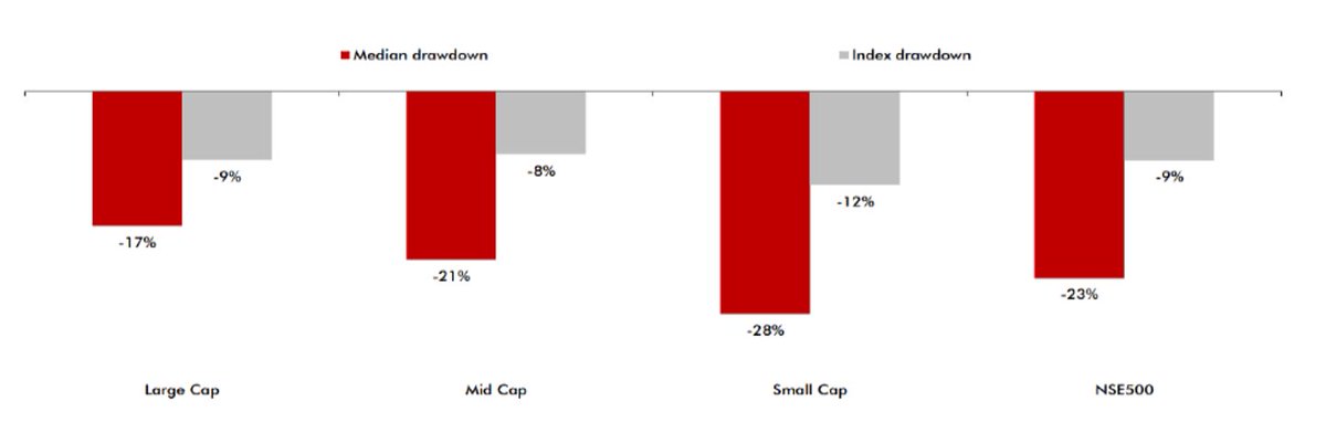 While the index drawdown looks modest, the median drawdowns of individual constituents from their 52-week highs have been far deeper, highlighting the broad-based pressure across stocks.