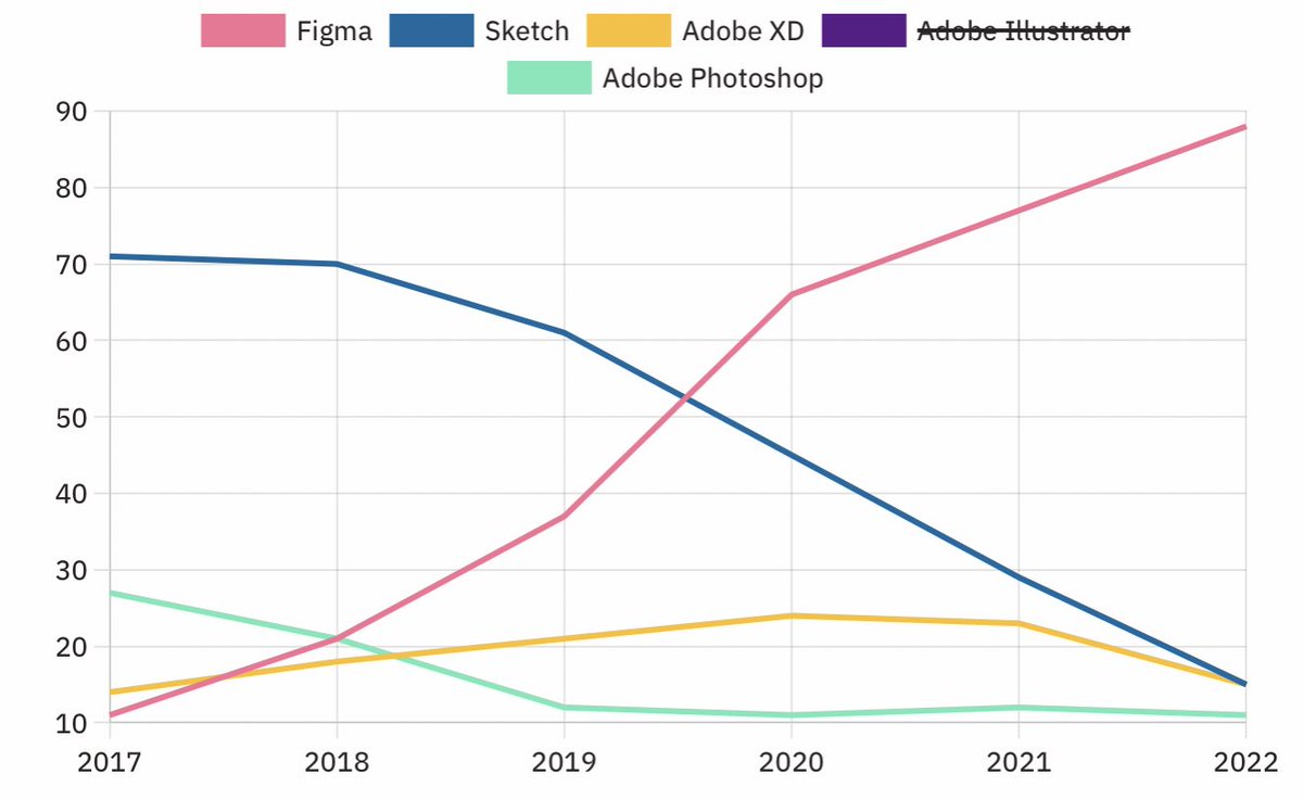 Figma 项目也启动于 2012 ,2016 首次发布,2020 左右才超越 Sketch