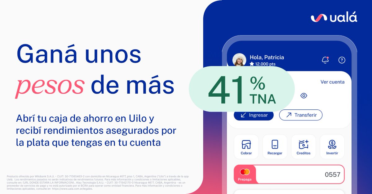 El producto más revolucionario es el más sencillo: ingresás plata a tu Caja de Ahorro @Uilo_arg. Y listo. Rinde diariamente a la mejor tasa. Para tu liquidez diaria. Y que después puedas pagar, transferir, invertir, cobrar y más. Siempre transparente, abierto, mejor.
