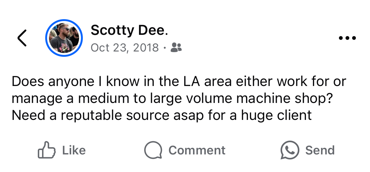 October 2018 - My friend Scott posted on FB that he was looking for a CNC shop. I said "me!" and he told me I couldn't handle the volume (he was right).
