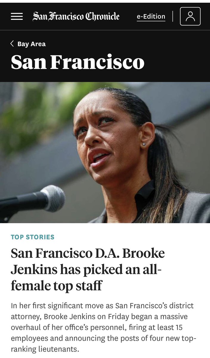 https://twitter.com/petercalloway/status/1548064195391791104Also troubling, the Chronicle’s framing. I mean look at this. Jenkins fires double the number Boudin did initially, gutting key units, and their headline is that she hired women in management positions.