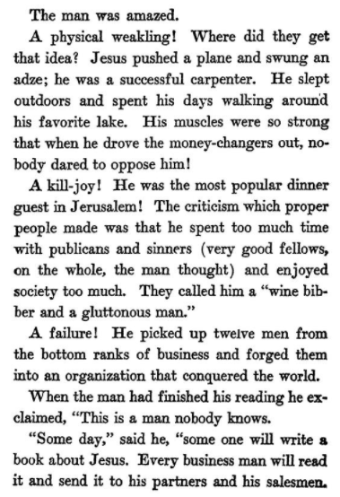 wow 'the man nobody knows' is absolutely iconic and exactly what it claims to be, a book about how Jesus was actually really buff and did lots of business