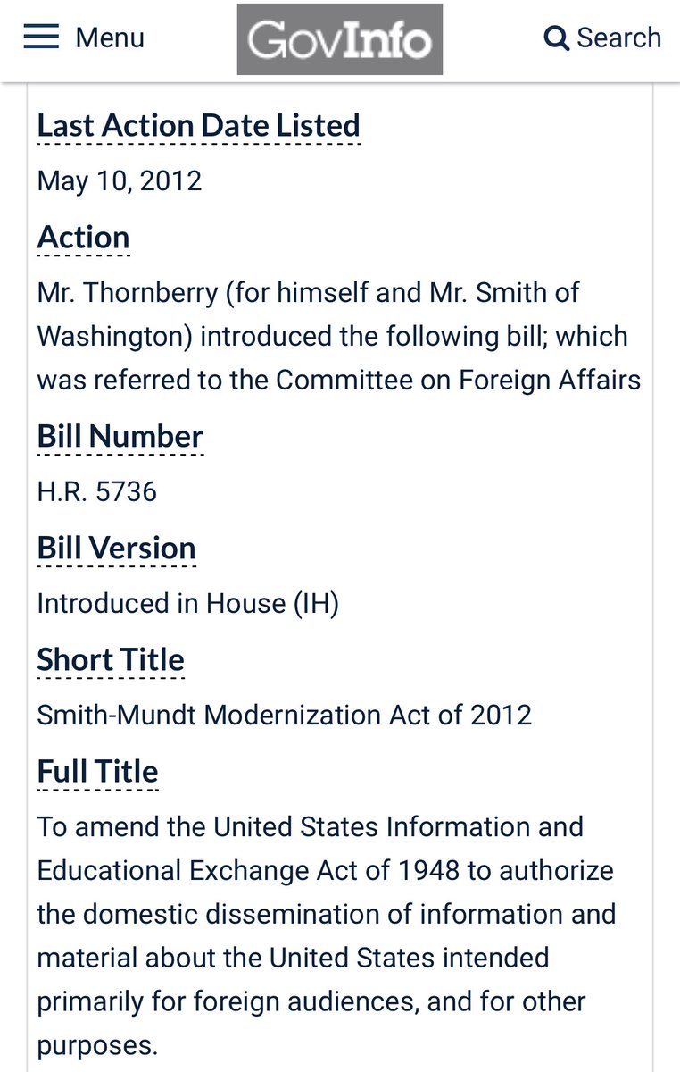 I think this is why. In the 2012 National Defense Authorization Act (NDAA), which was voted on and signed in December of 2011, just after the Arab Spring and Occupy cooled off, made it legal for the federal government to propagandize the america people. Prior to 2012 the feds… twitter.com/i/web/status/1…
