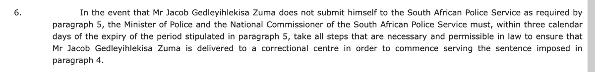 1) The duty of the SAPS to arrest Mr Zuma flows from Con Court order which requires Minister Bheki Cele and SAPS Commissioner to "take all steps that are necessary and permissible in law to ensure that Mr Jacob Gedleyihlekisa Zuma is delivered to a correctional centre." 2) Because the duty to arrest flows from a court order and not merely from a warrant of arrest, the Minister and the Commissioner do not have a discretion in the matter as no one is permitted to disobey a court order just because it is more convenient or politically expedient.