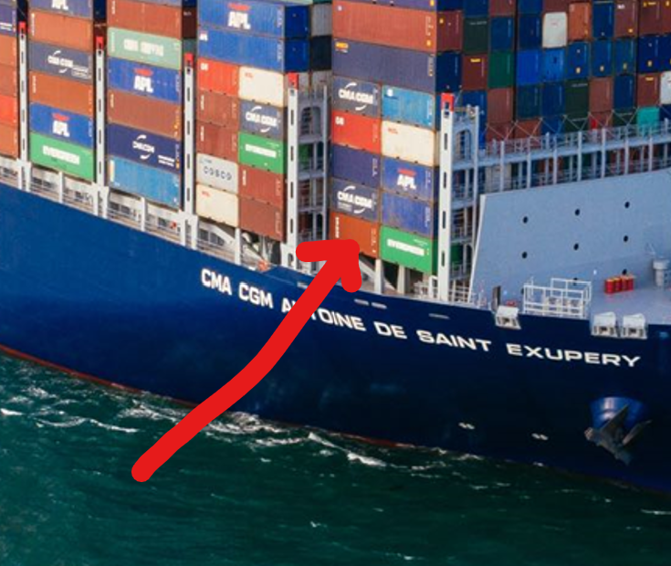 Alors ce gros machin, il s'appelle le Antoine de Saint-Exupéry, il appartient à la compagnie française CMA-CGM, mesure 400 m de long et peut transporter 20000 conteneurs de 6m (les petits comme celui au bout de la flèche)