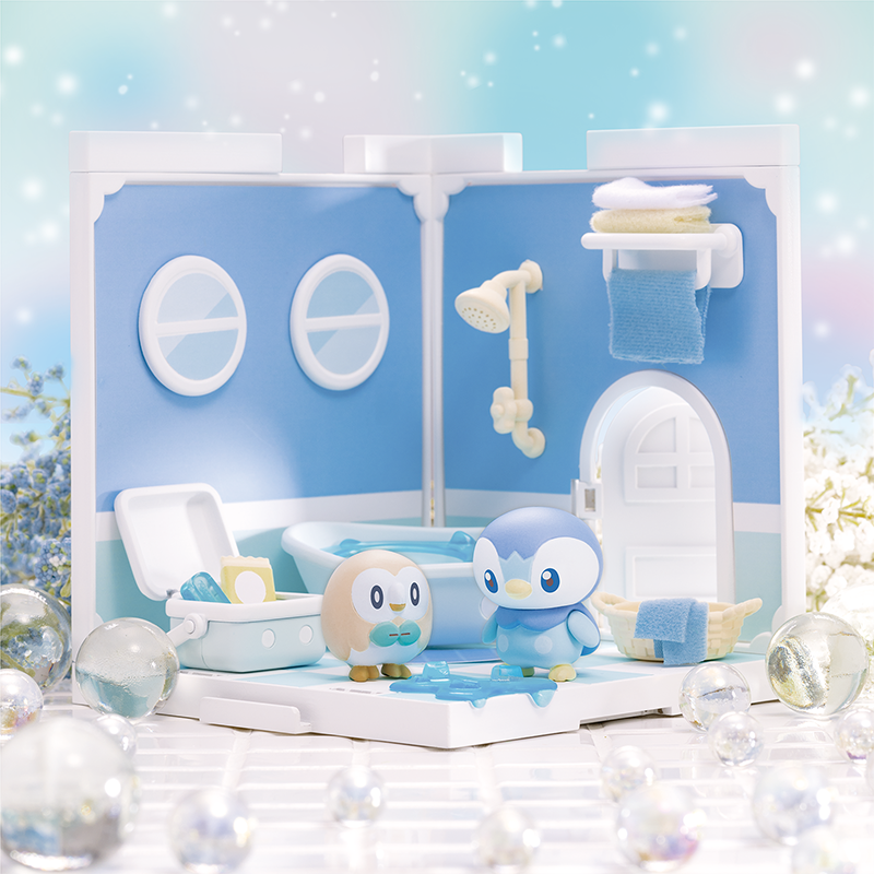 Kitchen featuring Milcery & Pikachu and bathroom featuring Rowlet & Piplup