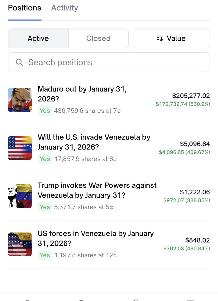 On December 2025, a brand-new account joins Polymarket. It immediately starts betting heavily on Venezuelan politics: YES on Maduro out by Jan 31, 2026; US invading Venezuela; Trump invoking War Powers; and US forces in Venezuela. Entry prices? As low as 6-7 cents per share—meaning the market saw these as long shots.