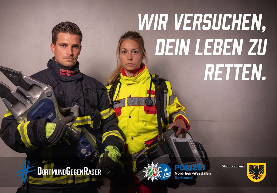 Die Teilnehmer illegaler Rennen gehen ein hohes Risiko ein. Mit eindringlichen Appellen fordern Einsatzkräfte von Polizei, Feuerwehr, Rettungsdienst und Notfallseelsorge die in Dortmund und auf den Autobahnen aktive Raser-Szene in einer gemeinsamen Kampagne zum Umdenken auf.