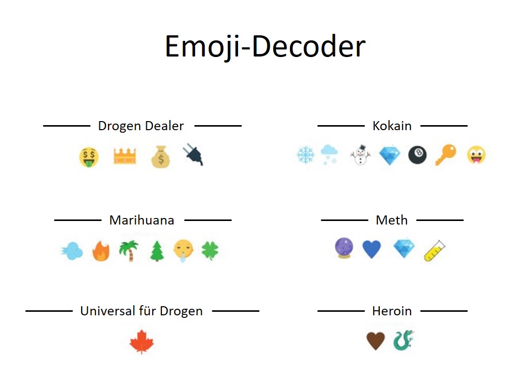 (2/7) Immer häufiger kaufen Jugendliche Drogen über Social-Media-Plattformen. Dabei werden Emojis und geheime Begriffe zum Kauf verwendet. Um Eltern über diese neuen Wege beim Kauf und Verkauf von Drogen aufzuklären, gibt es einen „Emoji-Decoder“.